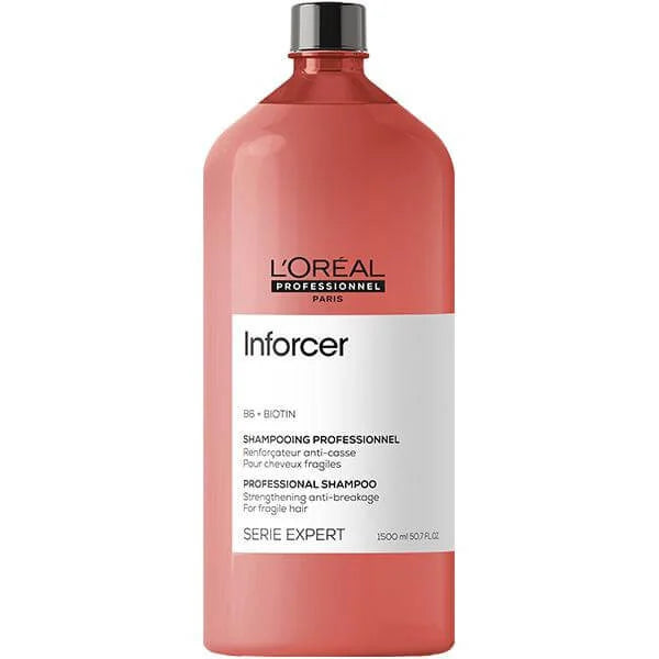 'Oréal Professionnel Serie Expert Inforcer Shampoo strengthens and reinforces fragile hair. This shampoo targets breakage and split ends, leaving hair soft and healthy. With use, you will see your hair become more resistant and stronger, thanks to this formula enriched with Biotin and B6 known for their strengthening properties. Pump non-included.
